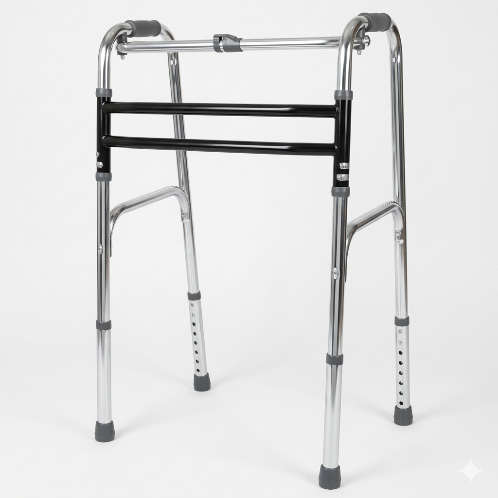 O Andador Articulado Dobrável Suporta até 130kg, Dobrável e de Fácil montagem, Compatível com par de rodas (vendido separadamente) e com apoio de mão anatômico.