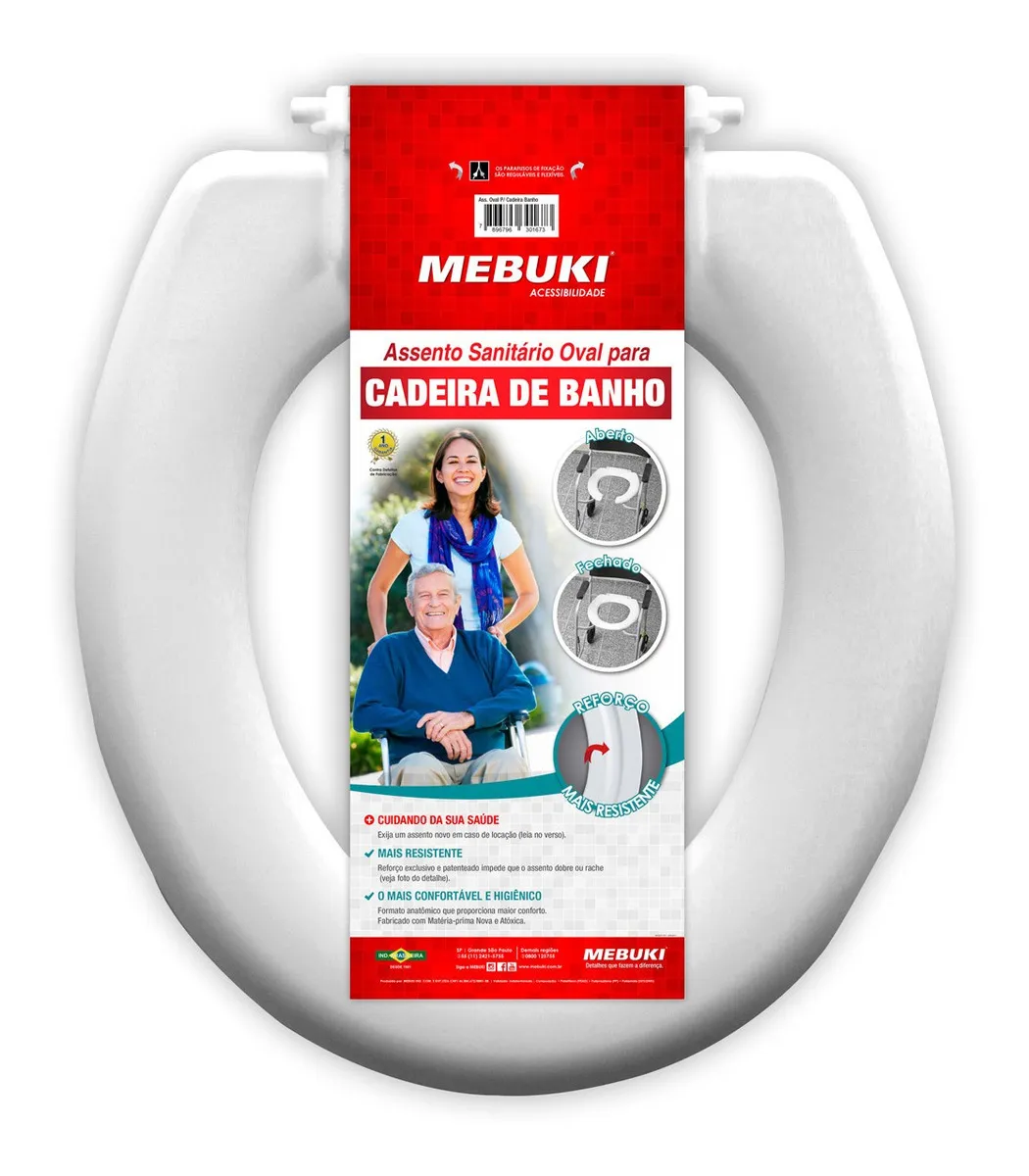O Assento Sanitário Fechado para Cadeira de Banho Mebuki é indicado para reposição e apoio durante o uso de cadeiras de banho, auxiliando na higiene pessoal com mais conforto e segurança.