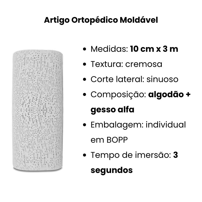 A Atadura Gessada 10 cm x 3,0 m Polar Fix Kit com 20 Unidades é indicada para imobilização e suporte em procedimentos ortopédicos, auxiliando na formação de estruturas rígidas.