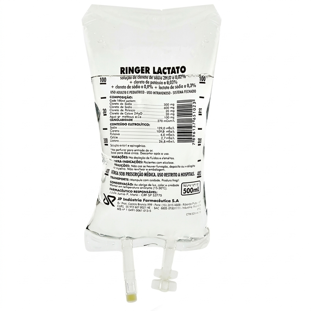 O Soro Ringer com Lactato Bolsa 500 ml JP é indicado para reposição de líquidos e eletrólitos, auxiliando na hidratação e equilíbrio do organismo.