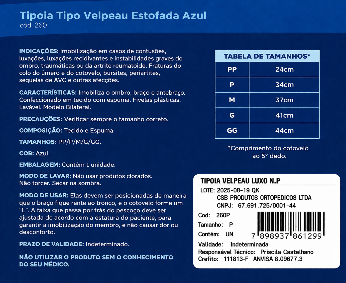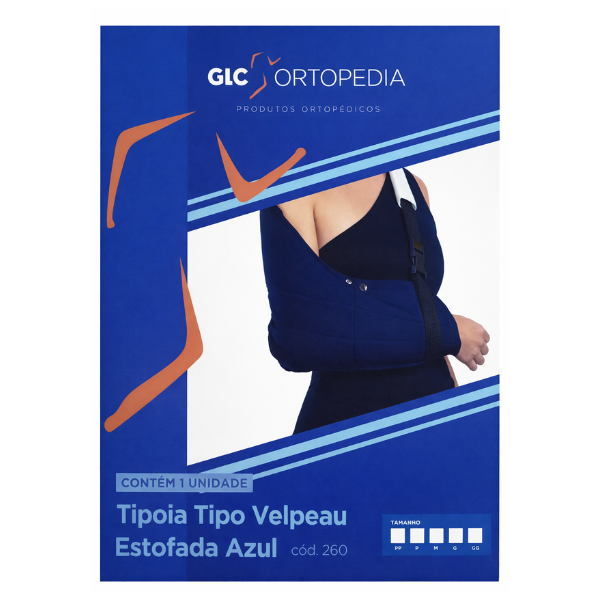 A Tipóia Tipo Velpeau Luxo Estofada Azul GLC Ortopedia é indicada para o suporte e imobilização do braço e ombro, auxiliando na redução de movimentos e proporcionando maior conforto durante a recuperação.